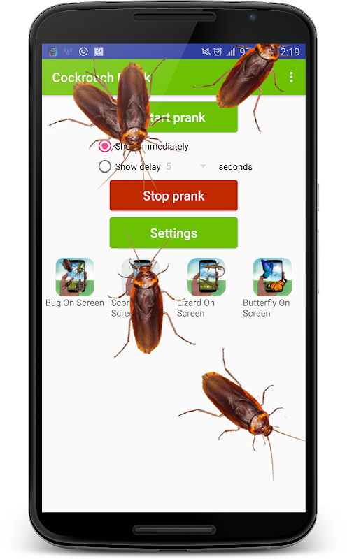 In this app, you will see cockroach run on your phone screen no matter you are listening to music, playing game or surf web. It will be fun to prank your friends and let's see funny joke how they act when see cockroach run all over screen.