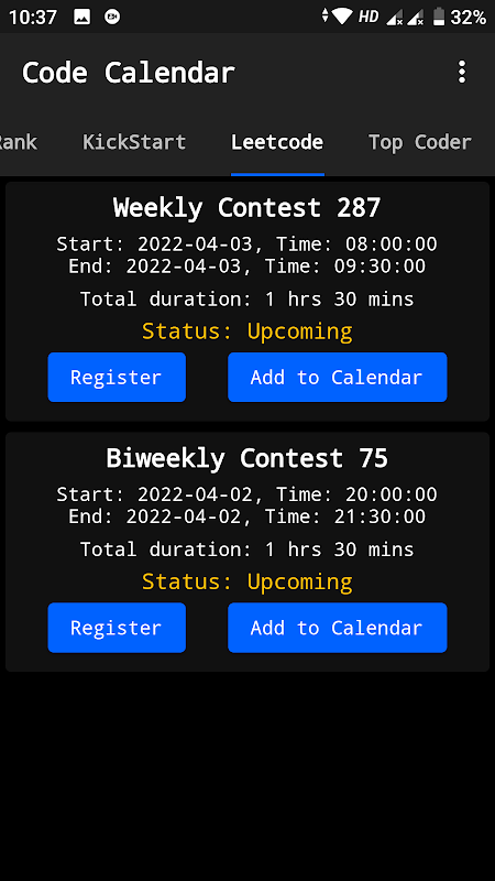 Code Calendar به شما این امکان را می دهد که مراقب مسابقات برنامه نویسی مختلف CP یا رقابتی در پلتفرم هایی مانند Codeforces، CodeChef، LeetCode، Google Kickstart و غیره باشید. از تقویم کد استفاده کنید تا هرگز مسابقه ای را در این پلتفرم ها از دست ندهید. از پلتفرم های محبوبی مانند Codeforces، CodeChef، Leetcode، AtCoder و غیره پشتیبانی می کند.