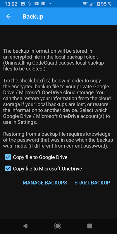 به صورت اختیاری ، یک کپی از فایل رمزگذاری شده می تواند در cloud در Google Drive یا Microsoft OneDrive ذخیره شود.