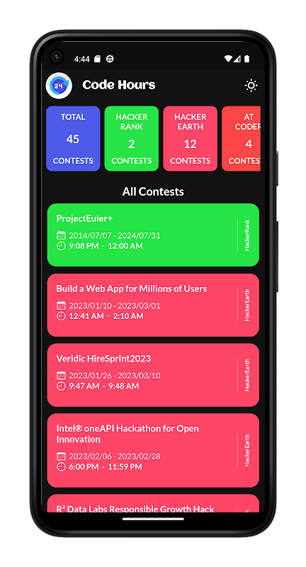 CodeHours برنامه ای است که به شما امکان می دهد تمام چالش ها و مسابقات برنامه نویسی و مسابقات برنامه نویسی رقابتی برگزار شده در پلتفرم های برنامه نویسی مانند HackerRank، HackerEarth، Codeforces، CodeChef، LeetCode، Google Kickstart، AtCoder و غیره را پیگیری کنید. این برنامه شما را به روز نگه می دارد. تمامی مسابقات در حال اجرا و پیش رو با قابلیت "افزودن رویدادها به تقویم" 🗓️ .