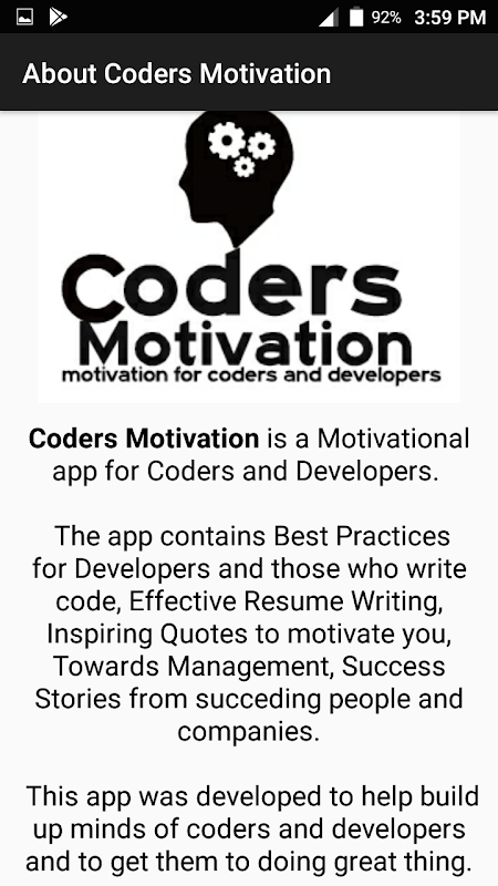 The app contains Best Practices for Developers and Coders, Effective Resume Writing, Inspiring Quotes to motivate you, Towards Management(Stress Management, Career Planning, Managing Managers), Success Stories from succeeding people and companies.