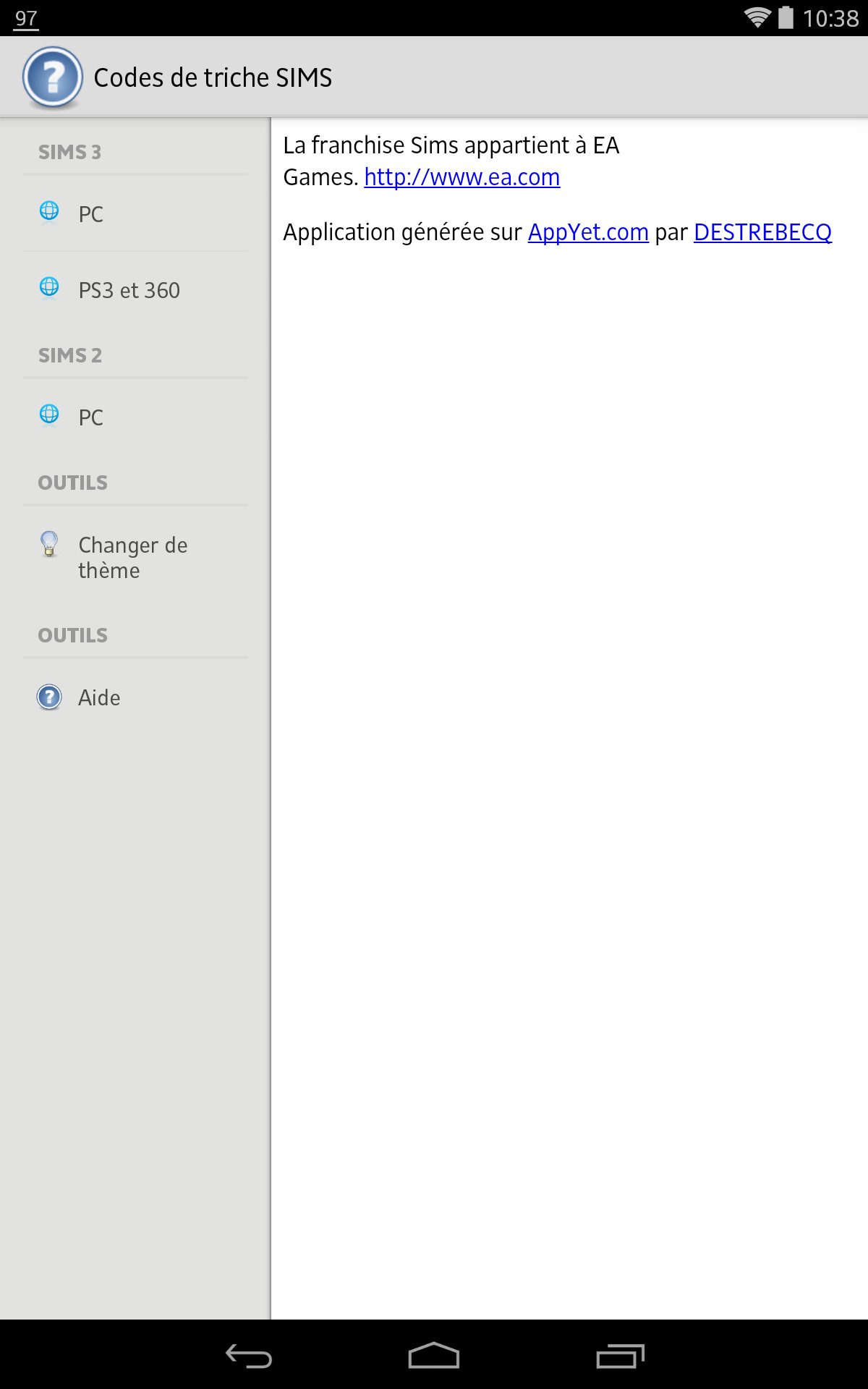 Retrouvez sur cette application les codes de triche de l'épisode 3 des Sims sur PS3 / Xbox 360 et PC mais aussi les codes de l'épisode 2 sur PC. Par la suite, les codes de triche de tous les autres Sims seront ajoutés au fur et à mesure des mises à jour. L'affichage des codes est adapté à votre écran !