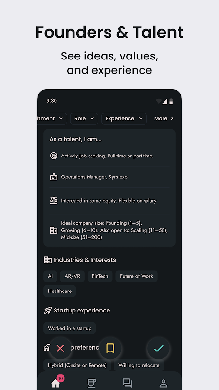 * تطبیق دو طرفه: ما افرادی را که به طور فعال به دنبال یکدیگر هستند، نه فقط کسانی که با معیارهای شما مطابقت دارند، به هم متصل میکنیم. چه بنیانگذاری باشید که به دنبال یک بنیانگذار مشترک یا اولین استخدام هستید، یا سازندهای که به دنبال پیوستن به یک تیم است، هر تطابق برای تناسب متقابل طراحی شده است.