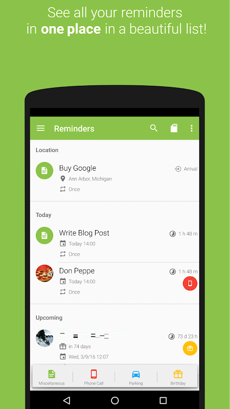 فقط یک یادآوری تماس را تنظیم کنید و برنامه دقیقاً در مورد قرار ملاقات به شما اطلاع می دهد - فقط با یک انگشت ضربه بزنید و تماس به طور خودکار منتقل می شود.