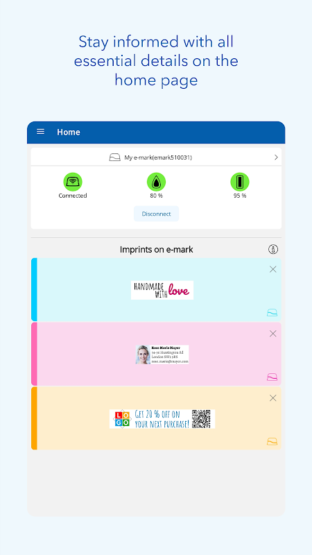 - اتصال بدون درز: برای چاپ سریع و آسان طرح های سفارشی خود، دستگاه e-mark خود را از طریق WiFi به برنامه متصل کنید.