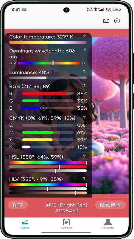 مشاهده داده های رنگ علمی برای ورود به حالت خبره، روی دکمه «مشاهده جزئیات» کلیک کنید. دمای رنگ (درجه کلوین)، موقعیت رنگ در طیف، مقادیر رنگ مدلهای رنگی مختلف (RGB، CMYK، HSV، و غیره) و درجه تطابق رنگ (درصد) مشابهترین رنگ را در پالت رنگ انتخابی نشان میدهد.
