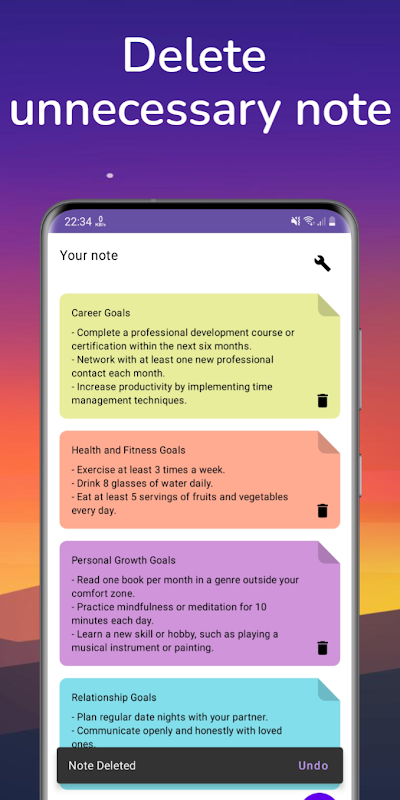 یادداشت های جدید را بدون دردسر ایجاد کنید و در صورت نیاز با رابط کاربر پسند ما آنها را به روز کنید. یادداشت های قدیمی را با یک کشیدن انگشت ساده حذف کنید و محیطی بدون درهم و برهم برای بهره وری بهینه حفظ کنید. یکپارچه در یادداشت های خود شیرجه بزنید، آنها را در زمانی که راحت هستید با طرحی که برای خوانایی بهینه شده است بخوانید.