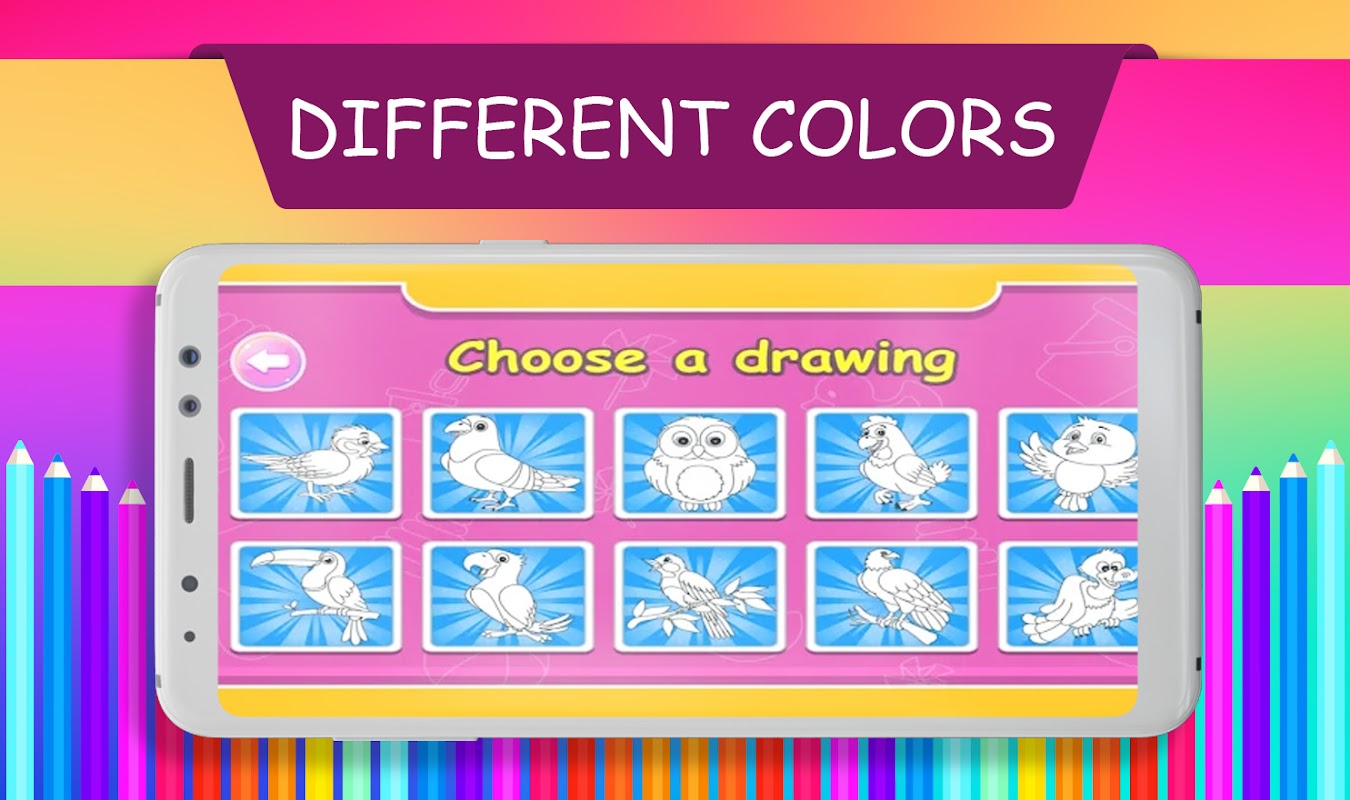 بیش از 100 صفحه سرگرم کننده با حیوانات ، پرندگان ، میوه ها ، سبزیجات ، پروانه ها ، اسباب بازی ها ، ماهی ها ، طرح ها ، گل ها ، وسیله نقلیه.