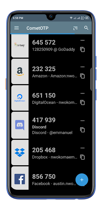 CometOTP به شما امکان می دهد یک لایه امنیتی اضافی برای حساب های آنلاین خود با تأیید هویت دو عاملی (2FA) اضافه کنید. CometOTP در حال حاضر دو الگوریتم تأیید اعتبار رمز عبور را پیاده سازی و پشتیبانی می کند: الگوریتم گذرواژه یک بار رمز (TOTP) و الگوریتم یک بار گذرواژه (HOTP) مبتنی بر HMAC. تمام کاری که شما باید انجام دهید این است که روش تنظیم 2FA را در حساب آنلاین خود دنبال کنید ، از CometOTP برای اسکن یا وارد کردن کد QR استفاده کرده و با کد 6 رقمی تولید شده توسط CometOTP به عنوان یک لایه اضافی برای محافظت از حساب خود وارد شوید. حساب آنلاین.