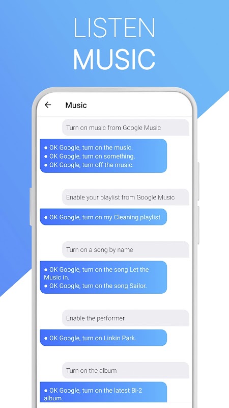 Please note that there is no built-in Google voice assistant in this "Commands for Google" app. This is a reference application with commands for the Google Voice assistant. Here you will find a complete list of voice commands, divided into categories.