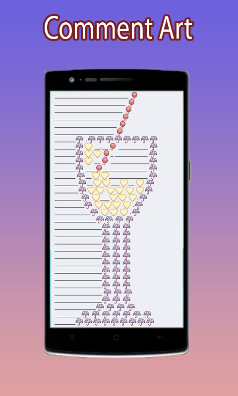 عاشق هنر عاشقانه؟ دریافت آخرین مجموعه ای از هنر نظر و نماد اس ام اس از طریق برنامه هنر متن. لذت بردن از هنر پیشگام، نمادها پیامک و تصاویر متنوع خیره کننده لذت ببرید. شما می توانید با فرستادن یک پیام اسکای هنر مردم و تعجب با متن asciiart نظر دهید. میخواهید هنرمند متن بشوید؟ تصاویر متن و احساسات متن را با کاراکترهای خاص و نمادهای Unicode خیره کننده ASCII ارسال کنید. هنر نظر دادن، تصاویری را که از متن و نمادها ایجاد می شود، نمادهای متن چهره بسیار زیبا و غیره ایجاد می کنند. هنر ASII را دریافت کنید و طیف گسترده ای از احساسات ASCII و عکس های متن را ارسال کنید.