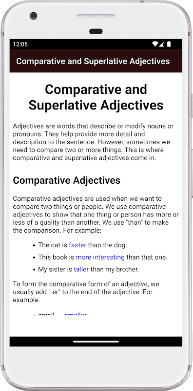 این برنامه یک راهنمای جامع برای کمک به زبان آموزان برای درک اشکال مختلف صفت های مقایسه ای و عالی همراه با مثال ها و قوانین استفاده ارائه می دهد. این برنامه دارای یک رابط کاربری آسان است که هم برای مبتدیان و هم برای زبان آموزان پیشرفته عالی است.