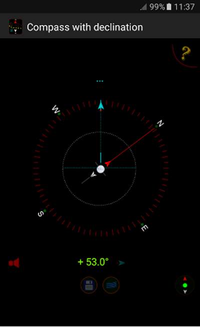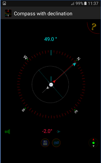 تشخیص مکان مبتنی بر GPS برای محاسبه انحراف مغناطیسی خودکار، و نشانگرهای بصری که بین شمال مغناطیسی (قرمز) و شمال واقعی (نارنجی) تمایز قائل میشوند. کاربران میتوانند یاتاقانهای قطبنما خاص را برای مراجعات بعدی در پایگاه داده ذخیره کنند، اعلانهای صدا را هنگام اشاره به آن تغییر دهند.