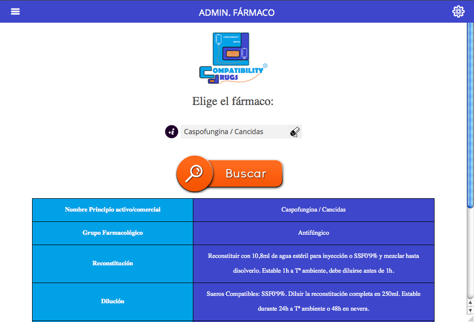 Aplicación móvil que pone a disposición de los profesionales sanitarios un buscador de acceso rápido y eficaz acerca de las potenciales compatibilidades físico-químicas entre fármacos parenterales, constituyendo una herramienta de gran utilidad para el personal sanitario durante el desarrollo diario de su práctica clínica a la hora de administrar medicación intravenosa.