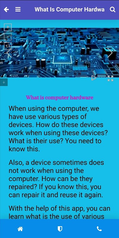 This app will help to increase knowledge about computer hardware. This app is very easy to use and very helpful to learn about computer hardware. Using this app you wil able to learn what is use of various computer hardware parts. This app includes basic knowledge of computer parts.