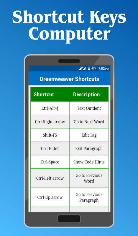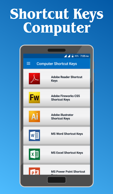 More than 50+ all software shortcut keys were in this app. mainly focused for the computer users to avoid using the Mouse. Computer shortcut keys app is offline internet based app and free app with latest collection of educational application where we can learn and increase their computer skills,typing speed and using keyboard shortcut keys skills.In this app is a huge collection of shortcuts of general and software which are very useful in day to day life of a school student, office users, computer users and professionals.