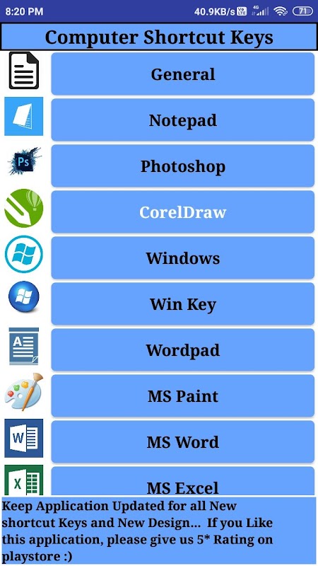 برنامه کلیدهای میانبر نرم افزار رایانه روشهای ساده و کوتاه برای یادآوری یا یادگیری استفاده از کلیدهای میانبر بیشتر راهنماهای کاربردهای نرم افزاری بیشتر است. کلیه کلیدهای میانبر برنامه Android برای یادگیری بیشتر دانش در مورد استفاده از نرم افزار در کیبورد مفید است ، مهارت های خود را پرورش دهید و آموزش سریع را برای درک آسان دانش آموزان دانشکده ، دانش آموزان مدرسه و کاربران دفتر به طور روان با استفاده از نرم افزار رایانه بالقوه خود را بیان کنند. در زندگی شغلی