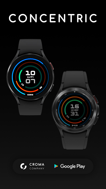 Concentric یک صفحه ساعت دیجیتال برای Wear OS است. در مرکز، زمان در قالب 12 ساعت یا 24 ساعت نمایش داده می شود و بین ساعت ها و دقیقه ها همیشه تاریخ ارائه می شود. هسته توسط سه میله دایره ای احاطه شده است. رنگ سبز داخل درصد باتری را نشان می دهد، رنگ قرمز مقدار ضربان قلب را نشان می دهد و آخرین مورد گام های روزانه را نشان می دهد. ضربه زدن بر روی تاریخی که تقویم باز می شود، ضربه زدن روی مقدار سطح باتری منوی نسبی را باز می کند در حالی که بالای مقدار مراحل یک میانبر قابل تنظیم وجود دارد، در مورد ضربان قلب، به یادداشت زیر مراجعه کنید.