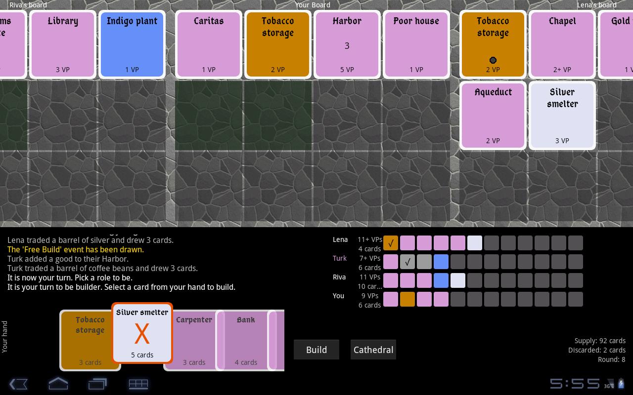 Condado is an unofficial implementation of Andreas Seyfarth's card game San Juan, which is in turn based off of the award winning board game Puerto Rico.