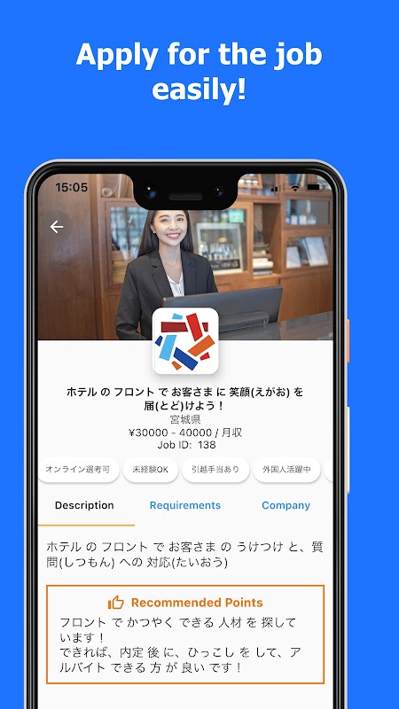 Connect Job WORKERS توسط Fourth Valley Concierge Corporation در ژاپن توسعه داده شده است. هدف ما این است که بهترین برنامه جستجوی کار باشیم تا بهترین مشاغل را برای خارجی ها و شرکت های ژاپنی با شهرت و رفاه خوب برای کارمندان مطابقت دهد.