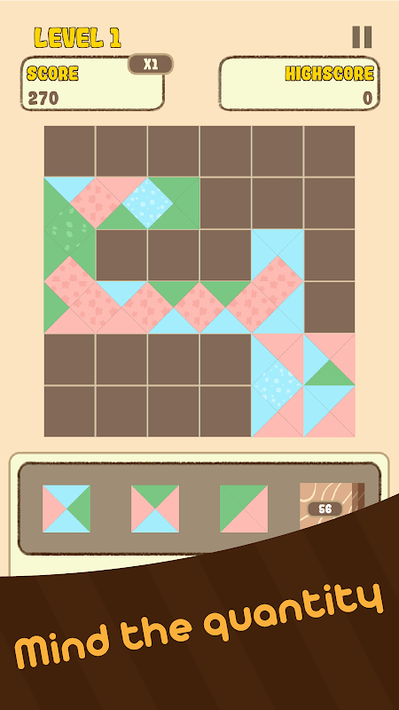 🌈 At the beginning of the stage, you will receive a number of square tiles. Each tile is made up of 4 triangles. And these 4 triangles are randomly in 3 colors