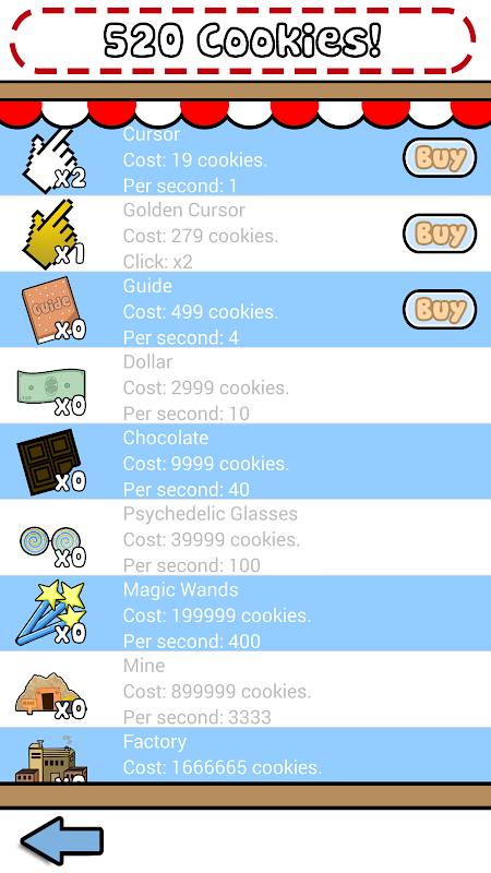 Enjoy hours and hours of fun baking cookies. Get powerups in the store to increase your production of cookies or click on the cookie to get more of thes. But pay attention, because the golden cookie may appear, do not miss out and you will get a good reward.
