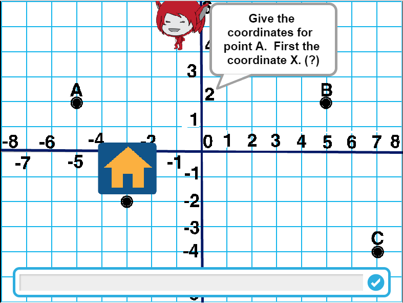 This is a game about Coordinate Plane. The student tries to help Nick (Assistant in game) to find the way back home. The player must find the correct coordinates, in order to find the way to his house.The game starts and the student sees 3 points A,B,C and the Home, Nick have to pass all the points with this order and finally arrives in Home. In total, we have 4 points(in random choice) in 4 quadrants. Nick asks for the coordinates of each point. If the player writes the right coordinates, then Nick walks(animation) to the next point, if not the assistant says <> and this is repeated so many times as the written coordinates is wrong. Every right pair of coordinates takes 1 point, every wrong pair of coordinates take 0 points. Finally, when Nick arrives in home goes to start and a new route form in the display, so he tries again to find the right pairs of coordinates for each point. Finally Nick announces the grade of the student. This is a funny game which reinforces skills in finding coordinates. With this game student practice coordinates on 4 quadrant grid. We believe this game is a useful teaching resource for Teachers, Parents and Kids.
