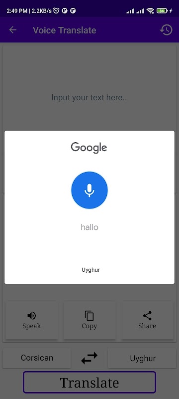 مترجم کورسی به اویغور به کاربران اجازه می دهد صحبت کنند و صدا را به متن ترجمه کنند (تایپ صوتی). سپس مترجم صوتی خودکار ورودی صوتی کاربر را به سرعت و با دقت تشخیص میدهد، مستقیماً به زبانی که تنظیم کردهاید ترجمه میکند و نتیجه ترجمه را با صدای بلند از طریق ویژگی متن به صدا میخواند. این ویژگی برای ترجمه متن از صدای شما مانند اویغور یا کورسی نیز می باشد. همچنین از طریق صدای خود از زبان کورسی به اویغور و اویغور به کورسی ترجمه کنید. این برنامه همچنین توسط ویژگی Speak to Text پاسخ داده شده است. به سادگی متن مورد نظر خود را وارد کنید و اجازه دهید کلمات کورسی یا اویغوری با صدای بلند برای شما صحبت کنید. شما می توانید تلفظ صحیح کلمات کورسی و کلمات اویغوری را بشنوید. این به بهبود مکالمه زبان کورسی و اویغوری شما کمک می کند. اکنون می توانید مانند یک زبان مادری نیز به نظر برسید. اکنون دایره لغات خود را بهبود ببخشید!