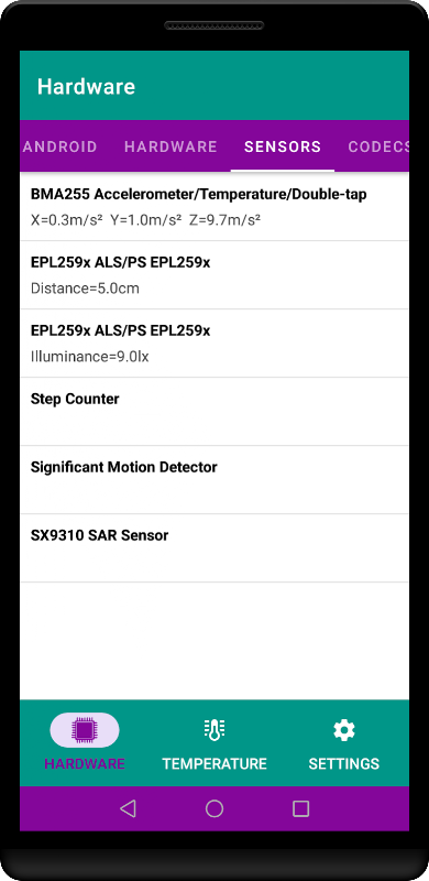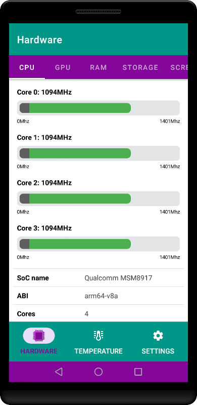CPU Device Info Test کامل ترین اطلاعات را در مورد دستگاه هایی مانند پردازنده، هسته ها، سرعت، مدل، رم، دوربین، سنسورها و غیره نشان می دهد. داده های زنده!