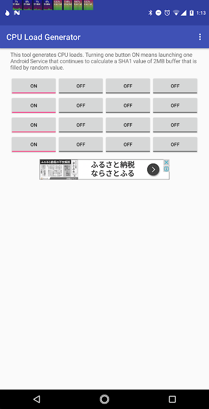 این ابزار چندین سرویس اندروید را راهاندازی میکند که همچنان مقدار SHA1 بافر 2 مگابایتی را محاسبه میکند که توسط دادههای تصادفی پر میشود. با فشار دادن دکمه میتوانید تعداد سرویسهای Android راهاندازی شده را کنترل کنید. اساساً من فکر می کنم که بارگذاری CPU زمانی بالاتر است که تعداد سرویس ها را به اندازه تعداد هسته CPU راه اندازی می کنید.