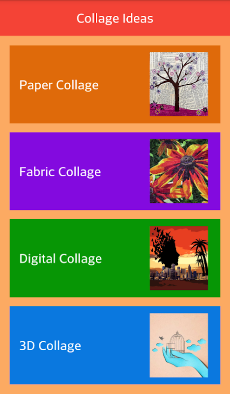 Collage is a creative type of art, the art of making a picture by sticking various different materials like picture, paper, cloth, fabric, wood etc. onto a large surface. The technique of art has many types like paper collage, fabric collage, digital collage, 3-dimensional collage, mosaic, eCollage etc. This app contains many new and creative ideas about collage. The app is divided into four categories