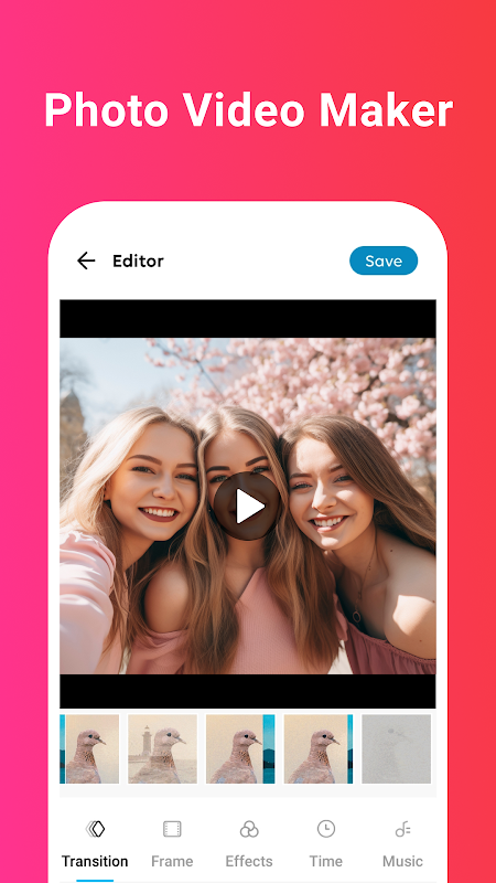 همچنین می توانید انتقال، فریم، افکت و موسیقی را به ویدیوهای خود اضافه کنید تا ظاهری منحصر به فرد و حرفه ای داشته باشید. خواه تولد، عروسی، مسافرت یا یک روز معمولی با دوستان باشد، این برنامه تبدیل عکس ها را به ویدیوهای پر جنب و جوش با موسیقی، تغییرات و جلوه های خلاقانه آسان می کند. بدون زحمت ویدیوهایی با ظاهر حرفه ای ایجاد کنید و آنها را در رسانه های اجتماعی به اشتراک بگذارید!