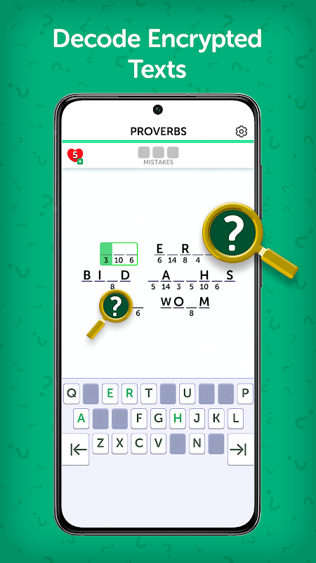 ماموریت شما این است که هر رمزنگاری را با کشف جایگزینی صحیح حروف حل کنید. با پیشرفت، هیجان شکستن کدها را تجربه خواهید کرد و قدردانی شما از پازل ها و زبان را افزایش می دهد.