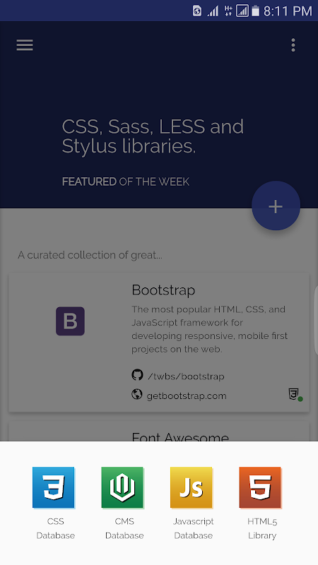 CSS Database include: bootstrap (The most popular HTML, CSS, and JavaScript framework for developing responsive, mobile first projects on the web), Font-Awesome (The iconic font and CSS toolkit), animate.css (A cross-browser library of CSS animations. As easy to use as an easy thing.), zurb/foundation-sites (The most advanced responsive front-end framework in the world. Quickly create prototypes and production code for sites that work on any kind of device), ionic (Advanced HTML5 mobile development framework and SDK. Build incredible mobile apps with web technologies you already know and love. Best friends with AngularJS), Semantic-UI (Semantic is a UI component framework based around useful principles from natural language), normalize.css (A collection of HTML element and attribute style-normalizations), materialize (Materialize, a CSS Framework based on Material Design), pure, Flat-UI, and more
