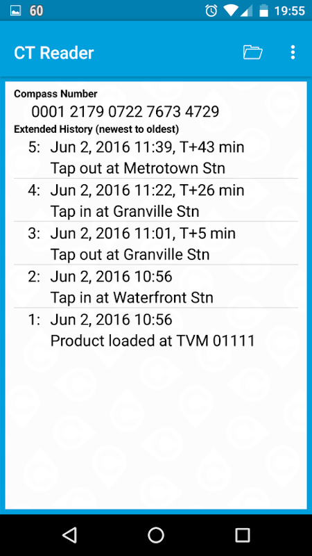 CT خوان یک برنامه NFC است که نمایش داده ها از بلیط TRANSLINK قطب نما است.