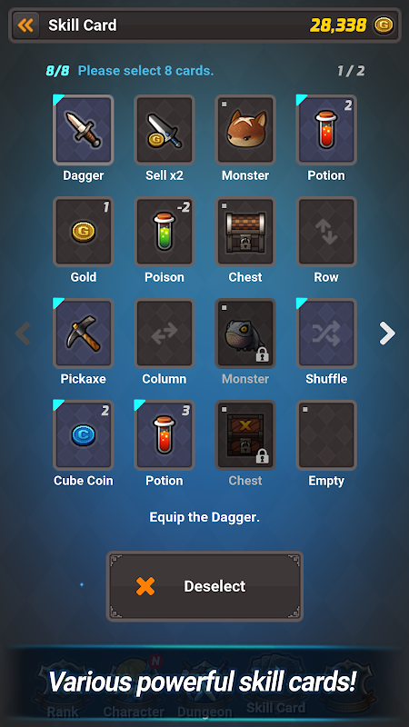 با سلاح ، Hp شخصیت و بمب به هیولاها و بلوک ها حمله کنید و با جمع آوری طلا ضمن بازیابی سلامتی شخصیت با معجون ، با جمع آوری طلا امتیاز جمع کنید. هنگام کسب کارت مهارت با قدرت مکعب ، می توانید با افزایش تعداد امتیاز ، سیاه چال ها و شخصیت های جدید به دست آورید. همچنین می توانید توانایی های شخصیت ها و کارت های مهارت جدید را با طلا از سیاه چال ها باز کنید.