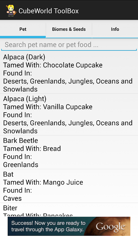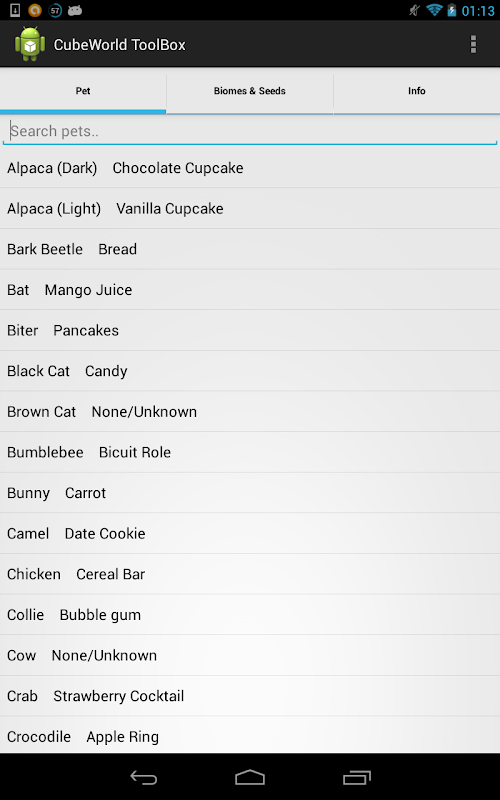 This app currently has two main purposes; pet taming information and seeds. There is a list of every animal in the game which a user can search through. Each animal has there food posted next to their names.