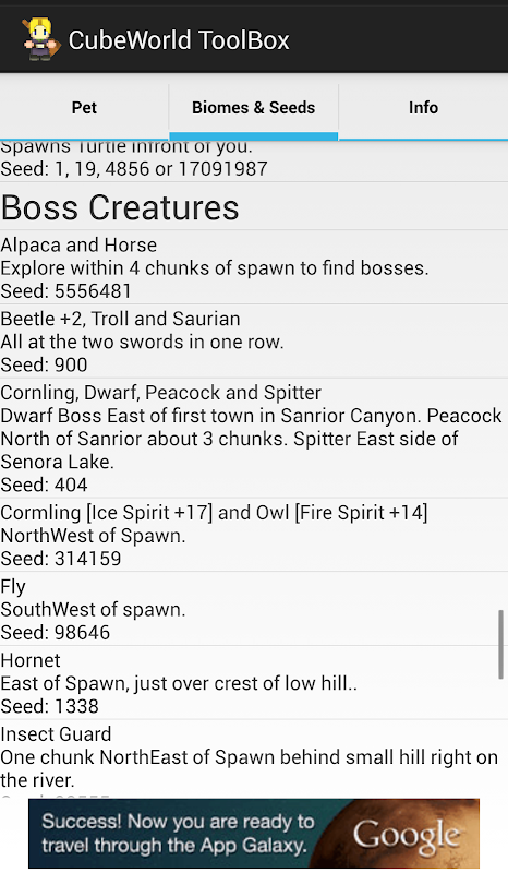 There are also seeds built into the app to allow the user to find seeds for Biomes, Items, Bosses and some tamable animals.