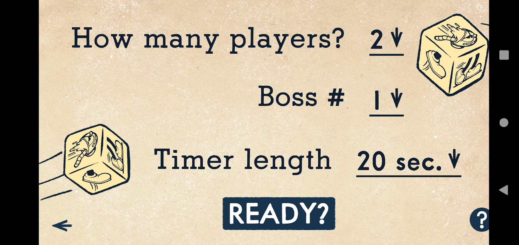 طول راندهای خود را انتخاب کنید: 10 ثانیه، 15 ثانیه یا 20 ثانیه و START را فشار دهید. در حالی که شما با تب تاس می اندازید، برنامه دور شما را شمارش معکوس می کند. تاس های خود را تا پایان زمان به چرخش و قفل کردن ادامه دهید. اگر باس را شکست دادید، K.O را بزنید. سپس توکن های HP، Parry، Wallop و Time باقیمانده خود را وارد کنید تا همه بازیکنان امتیاز نهایی خود را دریافت کنند!