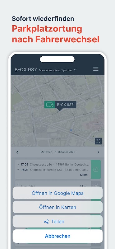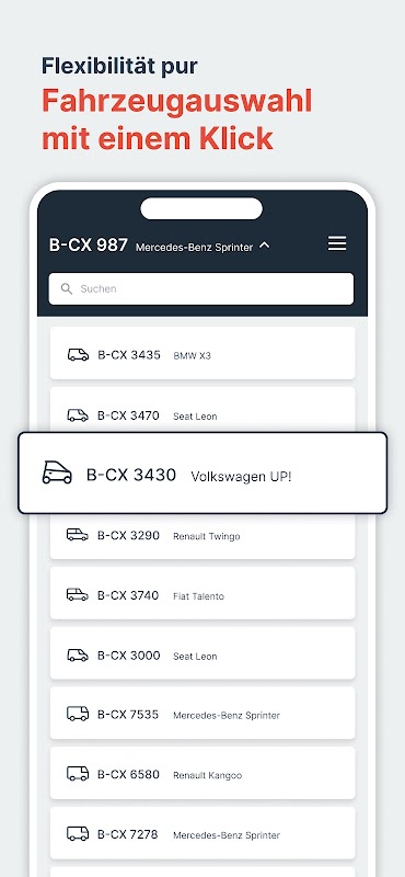 انعطاف پذیری خالص: انتخاب وسیله نقلیه با یک کلیک! اگر چندین وسیله نقلیه اختصاص داده شده باشد، راننده به سادگی از منوی کشویی روشن انتخاب می کند و می تواند بلافاصله حرکت کند. همه چیز برای یک سفر آرام - در هر زمان و هر مکان.