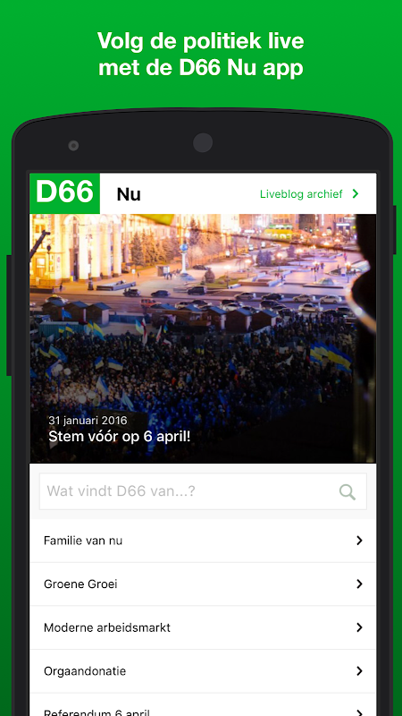Volg de politiek live met de D66 Nu app. Hierin vind je onze standpunten over langlopende en actuele onderwerpen. Bij bijvoorbeeld belangrijke debatten en TV-optredens kun je in deze app ook een live-blog vinden met achtergrondinformatie en inbreng van onze politici.
