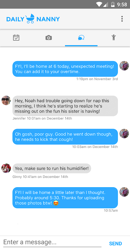 دایه (و پدر و مادر!) می توانید اطلاعات روزانه در مورد بچه ها مثل چرت زدن، بطری، غذا، دارو، و بیشتر می نماید. پدر و مادر اطلاعیه های فشار زمانی وقایع قابل توجه در طول روز اتفاق می افتد!