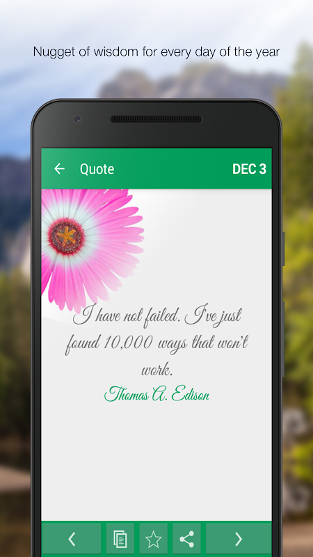 نقل قول های روزانه برای زندگی کردن، بخش های قدرتمند عقل هستند که به یک یا دو خط تقسیم می شوند. برنامه نقل قول روزانه با هدف ارائه یک لحظه کوتاه روزانه برای انعکاس و یا در زمان ناسازگاری، الهام بخش برای ادامه دادن است. من این نقل قول ها را به دقت انتخاب کرده ام. آنها شخصا با من مخالفت کردند و امیدوارم تا روزانه نقل قول ها را همان قدر که انجام می دهید لذت ببرم.