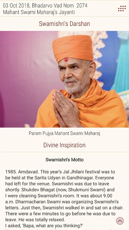 داستانی روزانه و خواندن روحانی بخشی جدایی ناپذیر از زندگی معنوی ما است. بخش "Daily Satsang" در وبسایت www.baps.org یک تازه کار و خواندن روزانه را فراهم می کند. برنامه "Daily Satsang" برای ایجاد تجربه مشابه در گوشی ها و رایانه های لوحی طراحی شده است.
