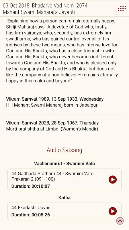این برنامه دارای بسیاری از بخش ها - Murti Daranshan، Swahashi's Darshan، الهام بخش الهام، سنگهای Vachanamrut، Prerna Parimal، تاریخ امروز و صوتی Satsang که ارائه می دهد روزانه از یک Vachanamrut، پنج Swamini واتو و Katha. حرکت به بالا به شما این امکان را می دهد که این بخش ها را مشاهده کنید.