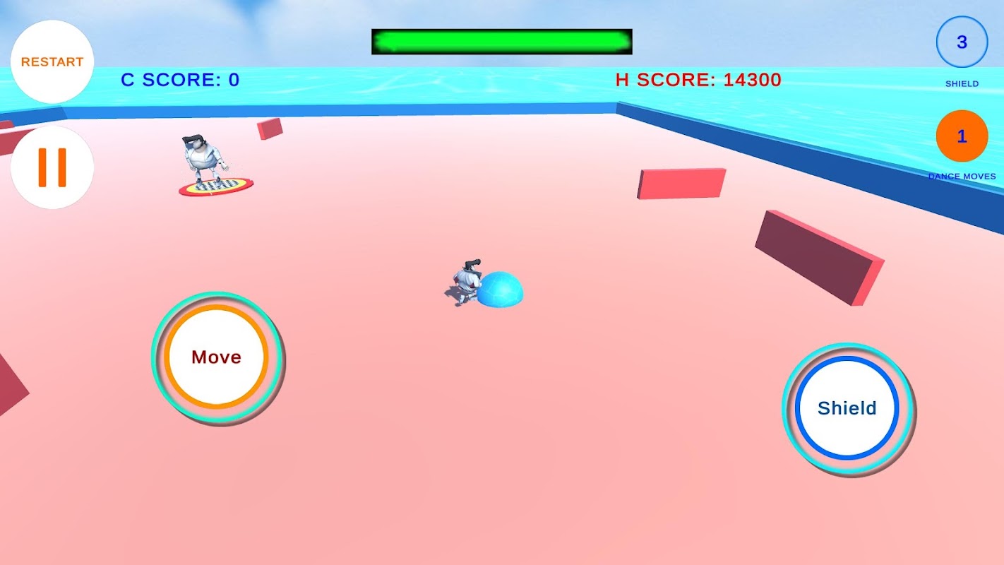DanceFloor Race is a Maze game whereby the player has to avoid being hit by sliding bars while trying to collect dance moves from dancing figures on the floor. The player's only protection from the sliding bars are shields which the player can collect by running into randomly placed blue balls or by using the 3 default shields he/she has through the shield button. When activated the shield enables the player to accumulate points whenever a bar is destroyed by the shield. The player also accumulates points when he/she collects dance moves from the dancing figures. The points are then credited to the player when he/she enters the checked dance floor, where the number of dance moves collected is multiplied by the number of points accumulated.