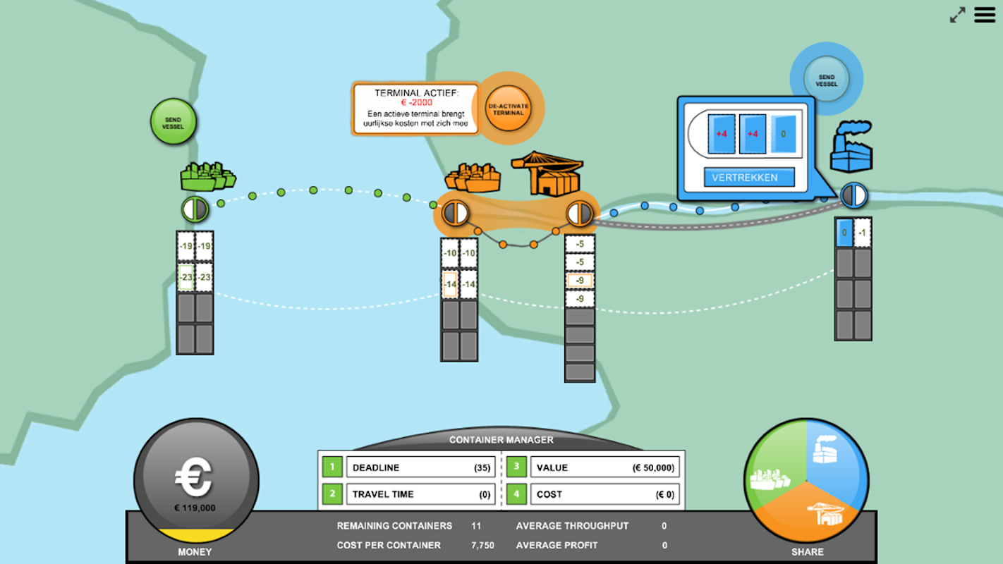 In this game you will attempt to transport all containers from the factory to the other side of the map as efficiently as possible. A container will travel from river to terminal and sea, before it will finally reach its final destination.