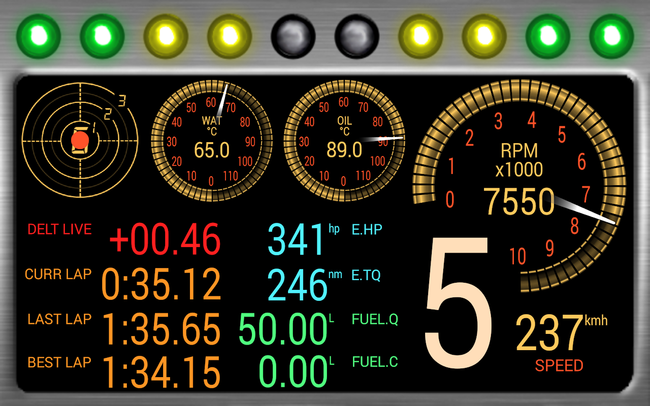 نشانگر دنده ، دور در دقیقه ، سرعت ، موقعیت ، بهترین / آخرین زمان دور ، زمان تقسیم خودکار ، تعداد دور ، دمای آب / روغن ، سوخت ، ساعت ، متر G-Force ، نشانگر دریچه گاز / ترمز.