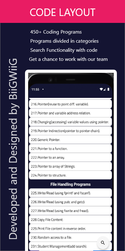 This app helps to solve Data structure code and Pattern Data structure . This app contains almost 500+ Programs and 2000+ Interview Examination Questions. This app has a very simple User Interface and contents can easily understood by User.