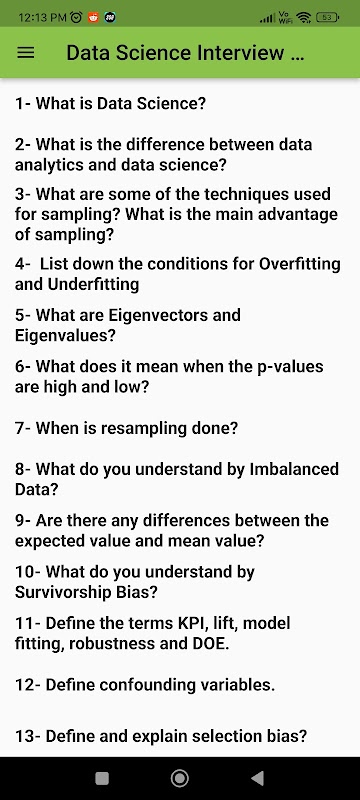"سوالات مصاحبه علوم داده" یک برنامه کاربردی تلفن همراه با ویژگی های غنی است که برای کمک به دانش آموزان، جویندگان کار و متخصصان در آماده شدن برای مصاحبه با تمرکز بر علم داده طراحی شده است. این برنامه با مجموعه گسترده ای از بیش از 150 سؤال، طیف گسترده ای از موضوعات مرتبط با علم داده را پوشش می دهد تا به کاربران کمک کند دانش خود را افزایش دهند و اعتماد به نفس خود را در طول مصاحبه افزایش دهند.